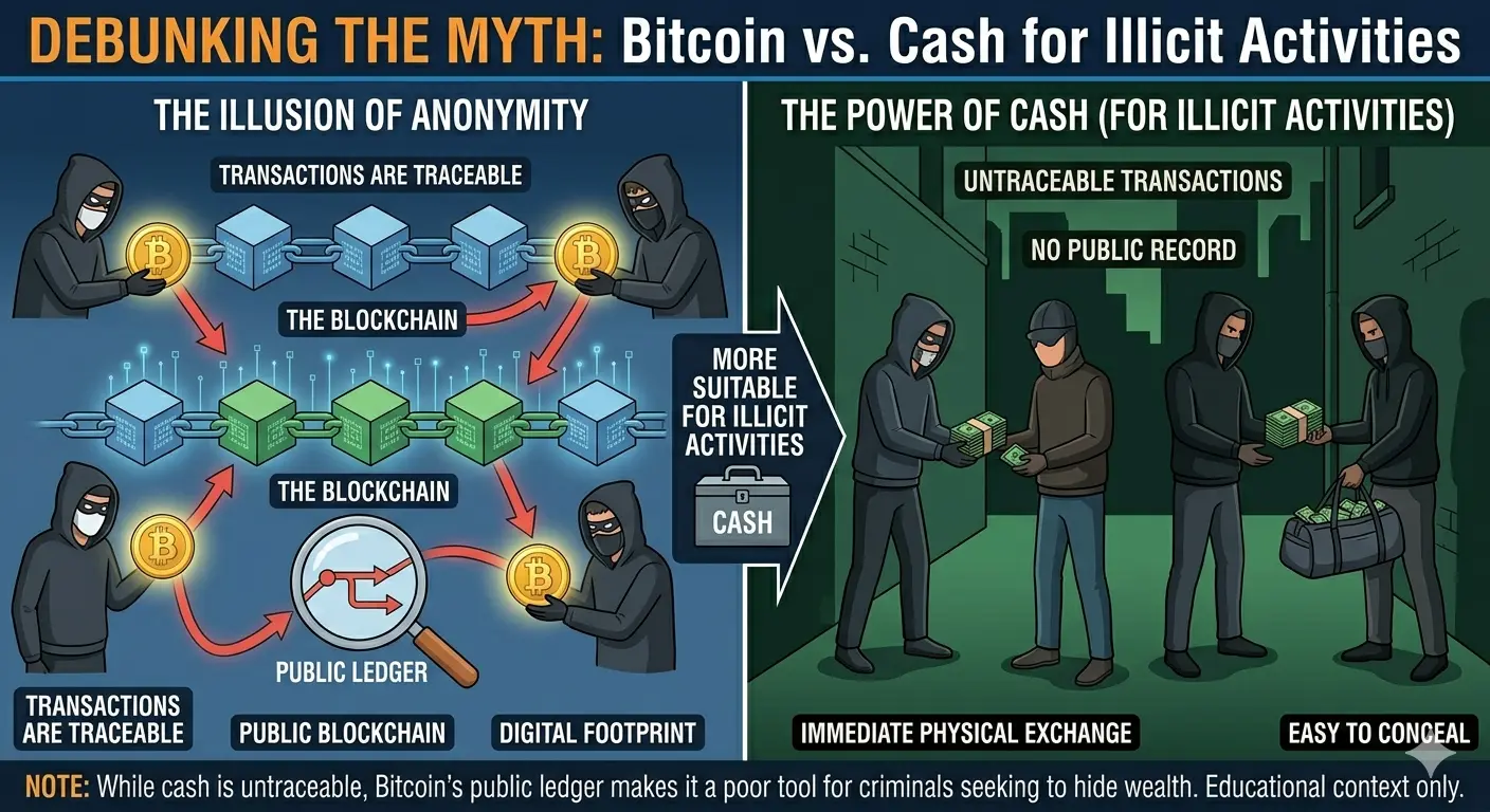 The irony is stark: physical cash remains entirely anonymous and untraceable, making it the true tool for illicit activity. Bitcoin’s pseudo-anonymity is a liability for criminals; a single mistake linking an address to an identity exposes their entire financial history. Consequently, the percentage of Bitcoin transactions linked to crime has fallen to under 0.5%—far lower than that of fiat currency. Rather than a criminal’s haven, Bitcoin has become an investigator’s ally, proving that public ledgers can be powerful tools for transparency and accountability.